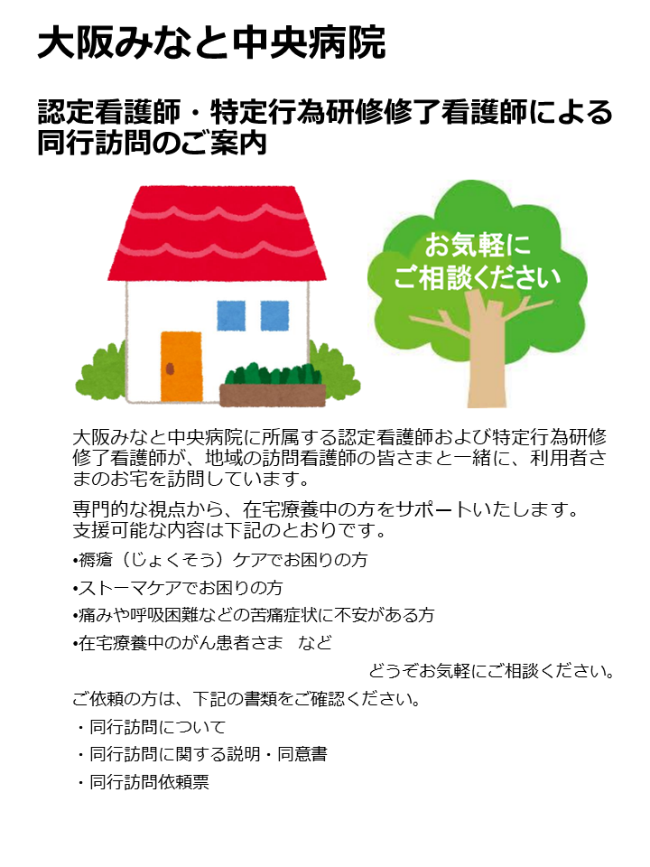 | 大阪みなと中央病院では、認定看護師などの専門スタッフが、地域の訪問看護師の皆さまと一緒に利用者さまのお宅を訪問しています。日々のケアの中で「この対応で合っているかな?」「もう少し良い方法はないかな?」と感じる場面に対して、当院の認定看護師などが同行し、ケアの方法を一緒に考えながらサポートいたします。どうぞお気軽にご相談ください。 |